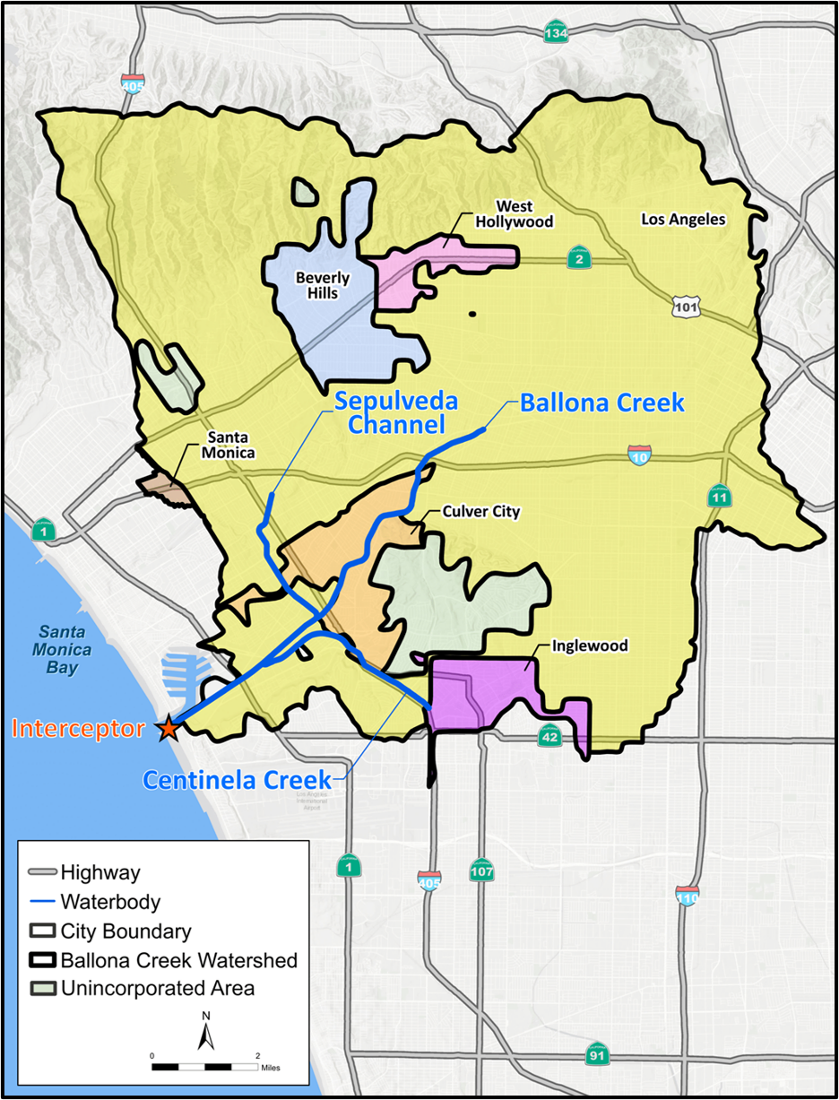 Ballona Creek is an approximate nine-mile-long waterway that is located within the coastal plain of the Los Angeles Basin and empties into the Santa Monica Bay between Playa del Rey and Marina del Rey. The Ballona Creek Watershed encompasses approximately 130 square miles; approximately 82.2 percent of the watershed is in the City of Los Angeles, 4.8 percent in Unincorporated Los Angeles County, 4.6 percent in the City of Beverly Hills, 4.1 percent in the City of Culver City, 2.5 percent in the City of Inglewood, 1.5 percent in the City of West Hollywood, and 0.3 percent in the City of Santa Monica. Most of the Ballona Creek drainage network has been modified into storm drains, underground culverts, and open concrete channels.